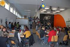 So ergaben sich in gemütlicher Runde entspannte Gespräche. Zur Unterhaltung der Besucher im Schulhaus Hof trug die Abschlussklasse S4 unter der Leitung von Christoph Fricker Mani-Matter Lieder vor.