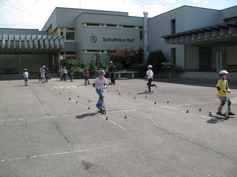 Koordination wie Slalomfahren, Balance halten mit dem Scooter? Kein Problem mehr für die Kursabsolventen! Von Kindergärtner bis 5. Klässler, jeder beherrschte am Kursende sein Kickboard. Wusste, wie Helm, Knie und Ellenbogenschoner plaziert sein müssen.