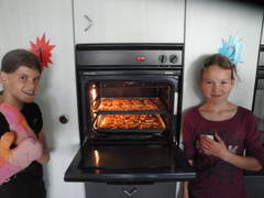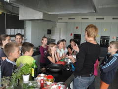 In 3er Gruppen durften sie aus verschiedenen Rezepten auswählen und dann machten sie sich top motviert an die Arbeit. Gemüse wurde geschnippelt, Häppchen gerollt, belegt und gestapelt. Da wurden Tomaten ausgehölt, upps, das war wohl etwas zu tief...Dort fliegen Schwingbesen in hohem Bogen durch die Luft. Macht alles nichts, Barbara und ihre zwei Helfer - Jasmin und Pascal - sind sofort zur Stelle und helfen den jungen Köchen und Köchinnen, die voller Konzentration Apéro-Häppchen wie für ein 5-Sterne Hotel herstellen.